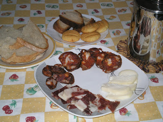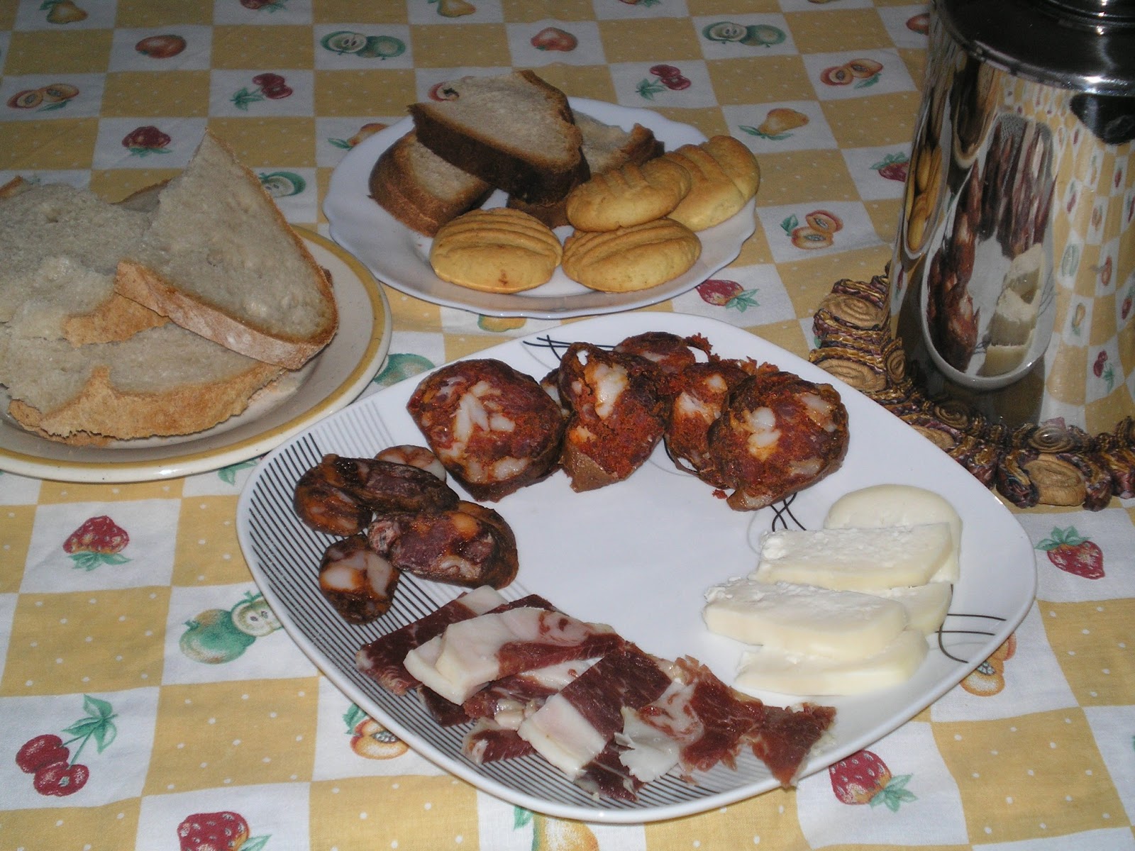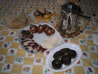 Ora e o lanche foi constituído por presunto, queijo, farinheira frita, linguiça e uma espécie de paio, tudo comido com um belo pão alentejano e acompanhado por um café de cafeteira mesmo bom. Para sobremesa por cima disto tudo comeu-se bolo de cenoura com cobertura de chocolate, folar e bolos de manteiga.