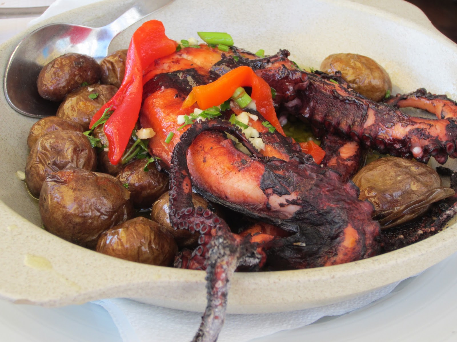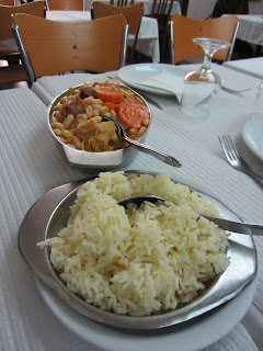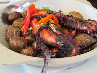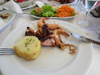 Diz que parece mal se não for peixe, mas como eu não sou muito amiga de peixe acabo sempre por me voltar para os moluscos. Adoro lulas e polvo, assim escolhemos umas espetadas de lulas com camarão, que na foto já não se encontram no formato de espetada mas já no prato. Escolhemos também um polvo à lagareiro. Ambos os pratos estavam bons mas as lulas eram mais saborosas embora as batatas que vinham com o polvo fossem melhores que as que acompanhavam as lulas.
