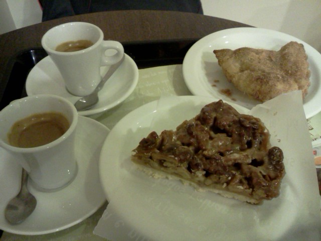 Há uns dias voltei a ir a uma Padaria Portuguesa mas desta vez para sentar e comer lá. Assim fui à que fica na zona da Avenida da República (Av. Elias Garcia, nº 96), bebi um café e comi uma azevia de grão que sabia muito bem e também dei umas boas trincas numa tarte de noz! Ambos os bolos eram bons, terei que lá voltar para provar mais coisas e quem sabe umas tostas que vi alguém a comer uma e tinha bom aspecto.