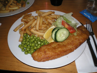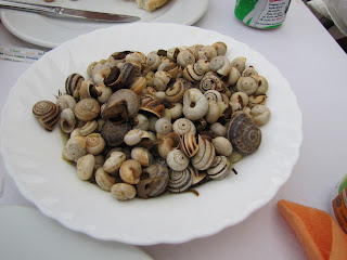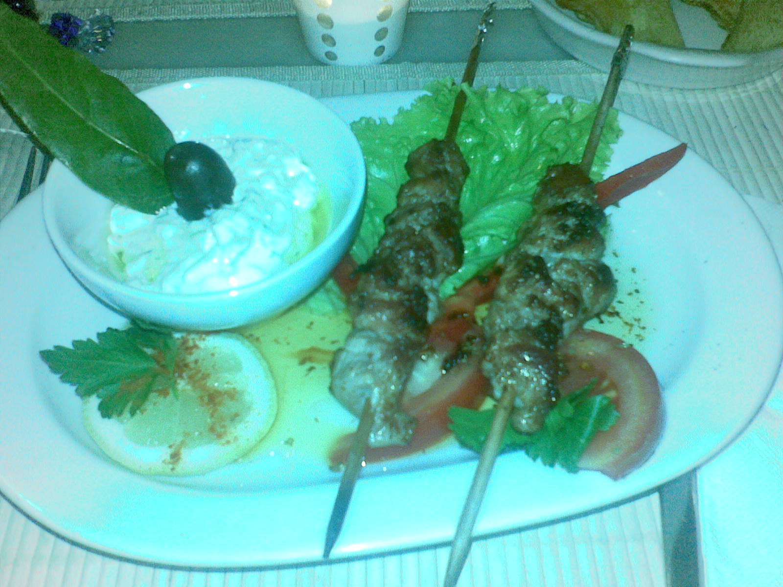 Os pratos principais eram souvlaki (espetadas de porco) com arroz grego e batatas fritas e Bacalhau enrolado em beringela com batatas fritas.