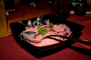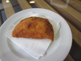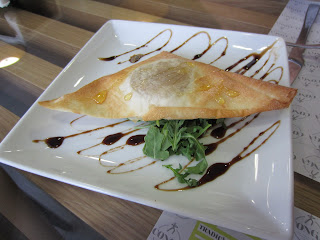 Quando chegamos lá já estava na mesa uma cesta com algumas variedades de pão e uma pasta de azeitonas e tomate. De entrada foi-nos servido uns croquetes de vegetais com tzatziki (molho de yogurte grego). Para prato principal podíamos escolher uma de 2 opções, mas como nós éramos 2 escolhemos os 2 pratos e dividimos ao meio, é que assim deu para experimentar ambos.