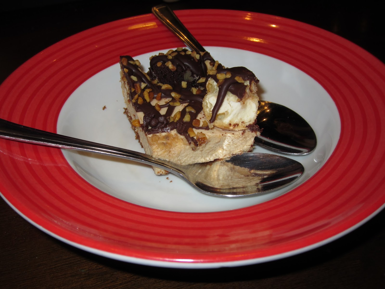 De sobremesa comemos um brownie de chocolate com gelado de baunilha, com o nome de "warm hazelnut chocolate brownie with a rich chocolate ganache served with vanilla ice cream". Era bem bom e a maneira como vinha servido bastante original.