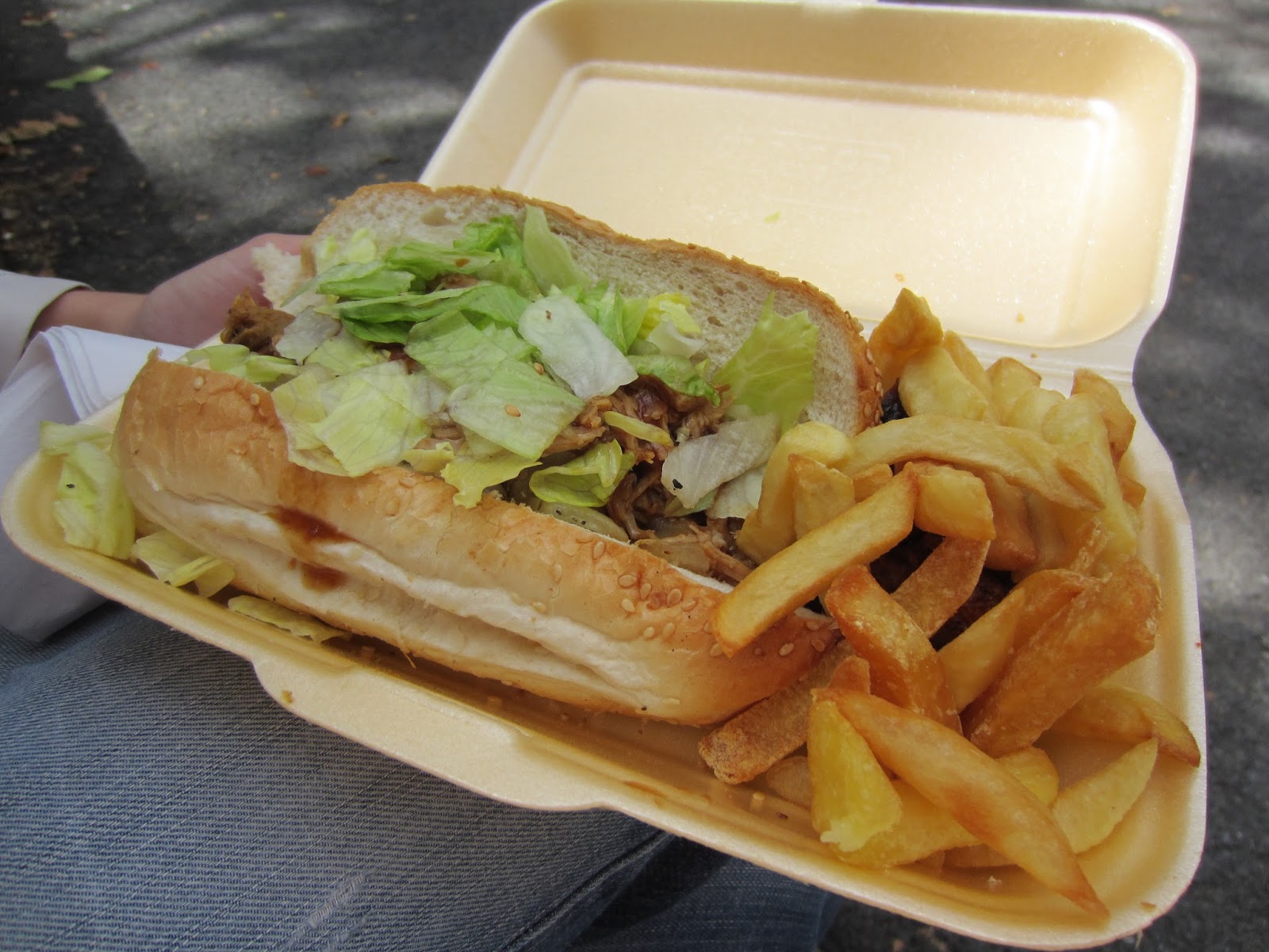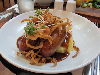 Quanto à comida, já não me lembro o nome do que comi, mas eram umas salsichas com molho colocadas em cima de puré de batata, por cima das salsichas tinha cebola frita que sabia que era uma maravilha! Provei também o sunday roast que vinha servido não num prato mas sim numa tábua, tal era a quantidade. Assim tive oportunidade de matar saudades do yorkshire pudding, o qual sou fã desde que tive a viver por terras de sua majestade.