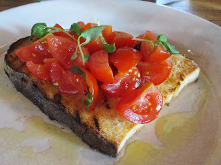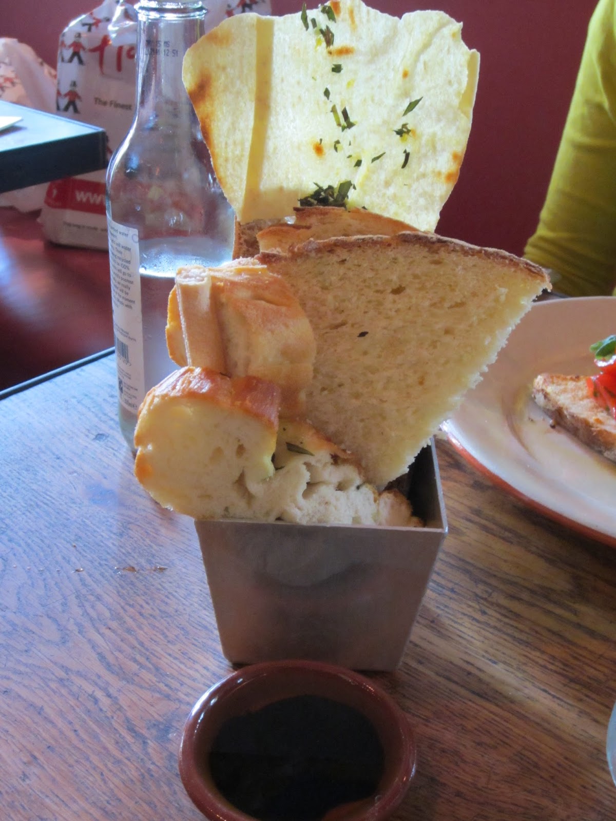 De entradas comemos uma "Bruschetta topped with sweet tomatoes, garlic, basil & olive oil" e "Italian bread selection", tudo muito saboroso mesmo levando manjericão que eu não gosto nada.