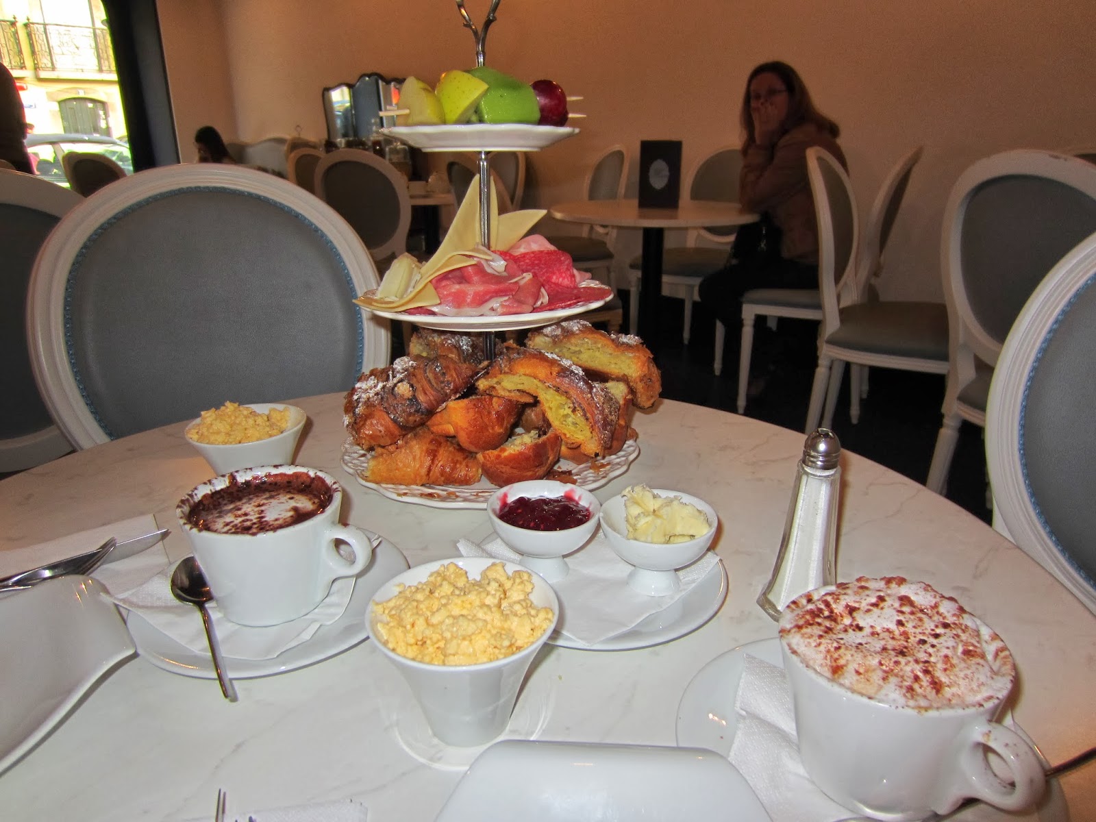 A quantidade de comida é brutal, o brunch é composto por uma espetada de fruta, um croissant simples, um croissant de amêndoa, um brioche, três tipos de queijo sendo um deles de fatia, presunto, fiambre, e chouriço. Tinha também uma taça com manteiga e outra com doce. Incluía uns ovos mexidos mesmo bons. Para beber escolhemos um cappuccino e um chocolate quente, o chocolate quente é maravilhoso, é autentico chocolate derretido e é bem espesso como eu gosto.