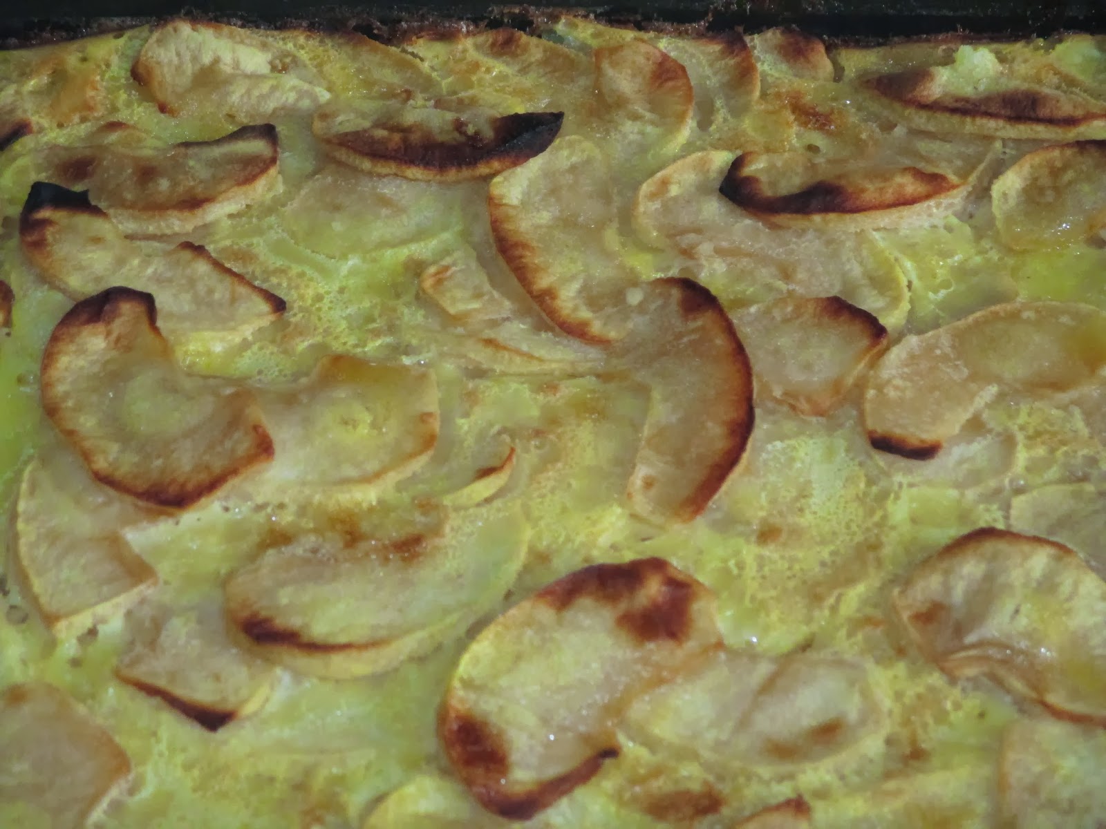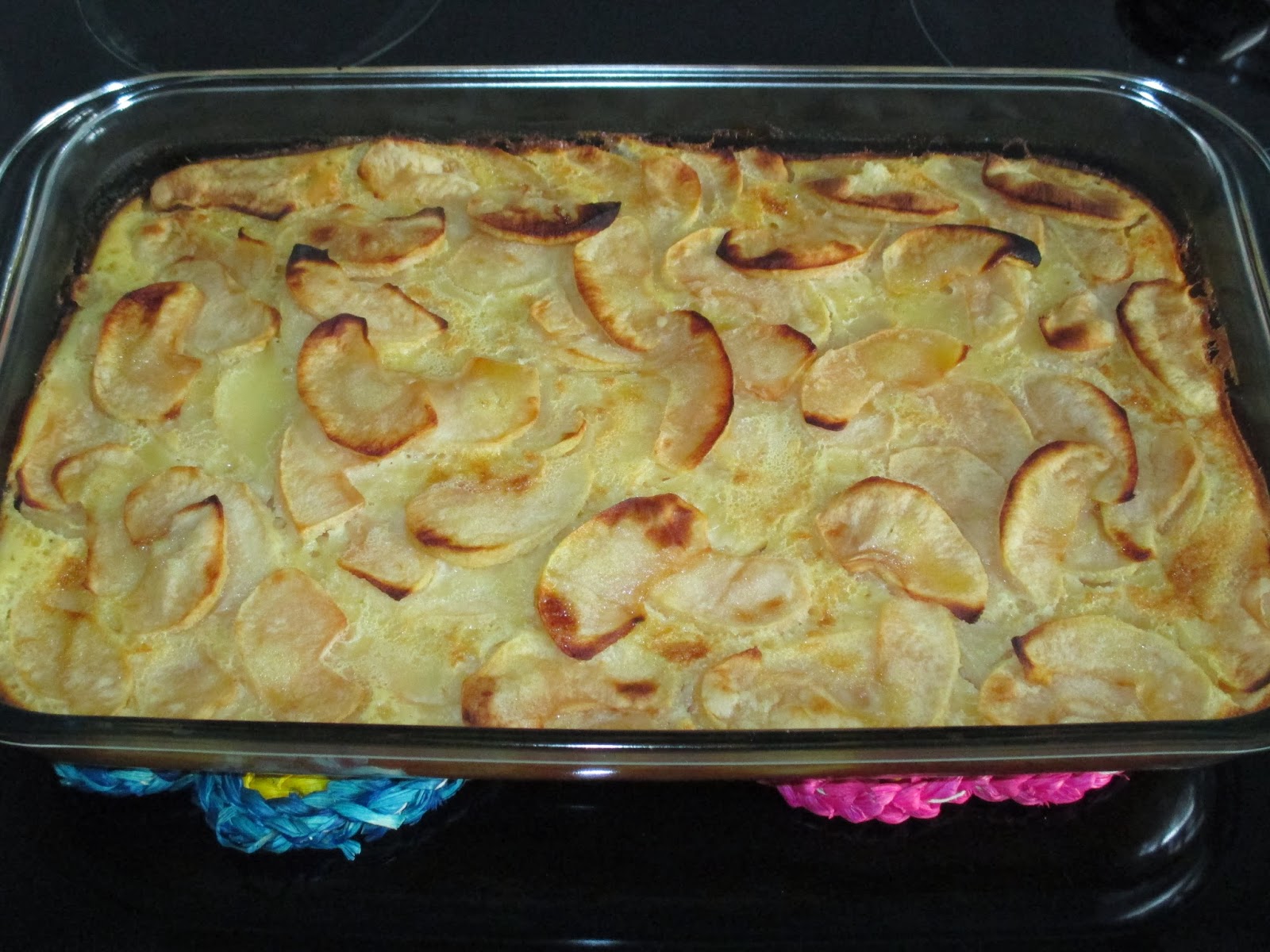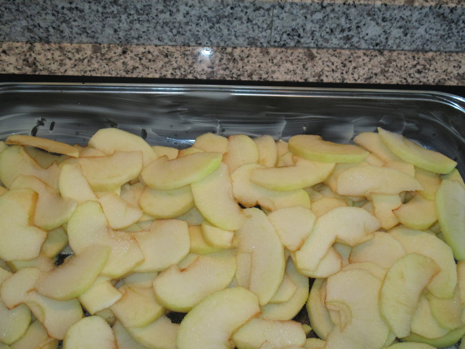 Untar um tabuleiro de ir ao forno com manteiga e cortar as maçãs aos quartos e depois em finas fatias e dispor no fundo do tabuleiro. Entre cada camada de maçã meter um pouco de açúcar. Depois verter por cima da maçã a mistura dos outros ingredientes, a maçã vai subir no líquido. Colocar a margarina aos pedaços espalhada por cima desta mistura. Levar ao forno bem quente cerca de 30-40 minutos.