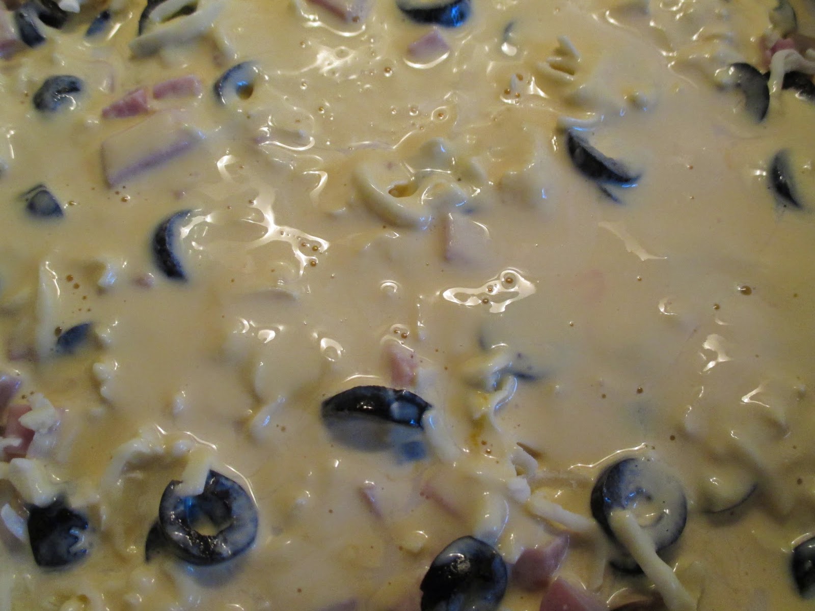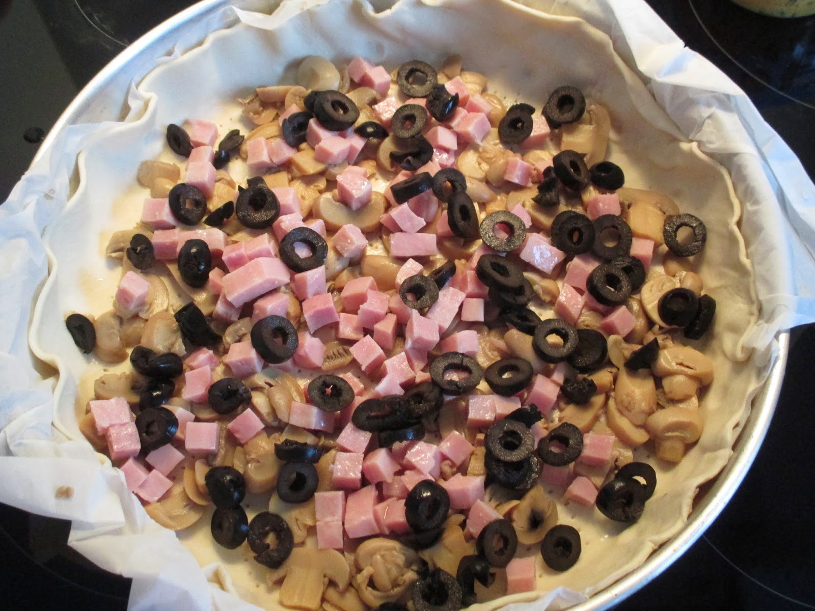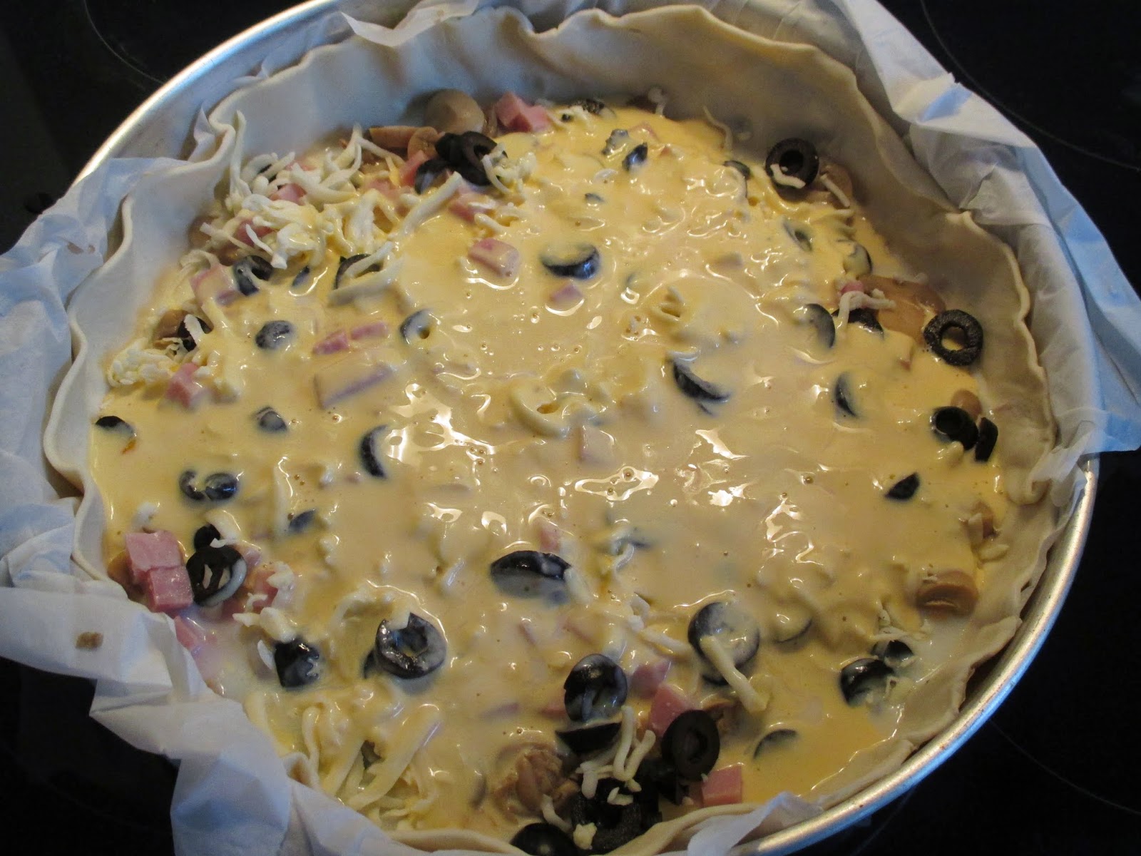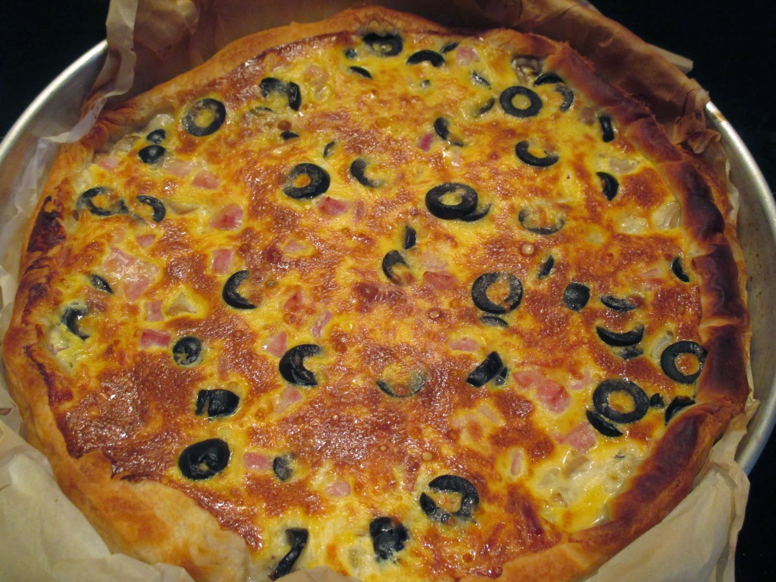 Depois coloquei uma lata de cogumelos, uma embalagem de fiambre cortado em cubos (100 g) e cortei em rodelas algumas azeitonas pretas (também de lata). Por cima espalhei queijo ralado. Depois foi só misturar 3 ovos e um pacote de natas (usei de soja) e espalhei por cima dos outros ingredientes. Depois foi só levar ao forno até dourar.