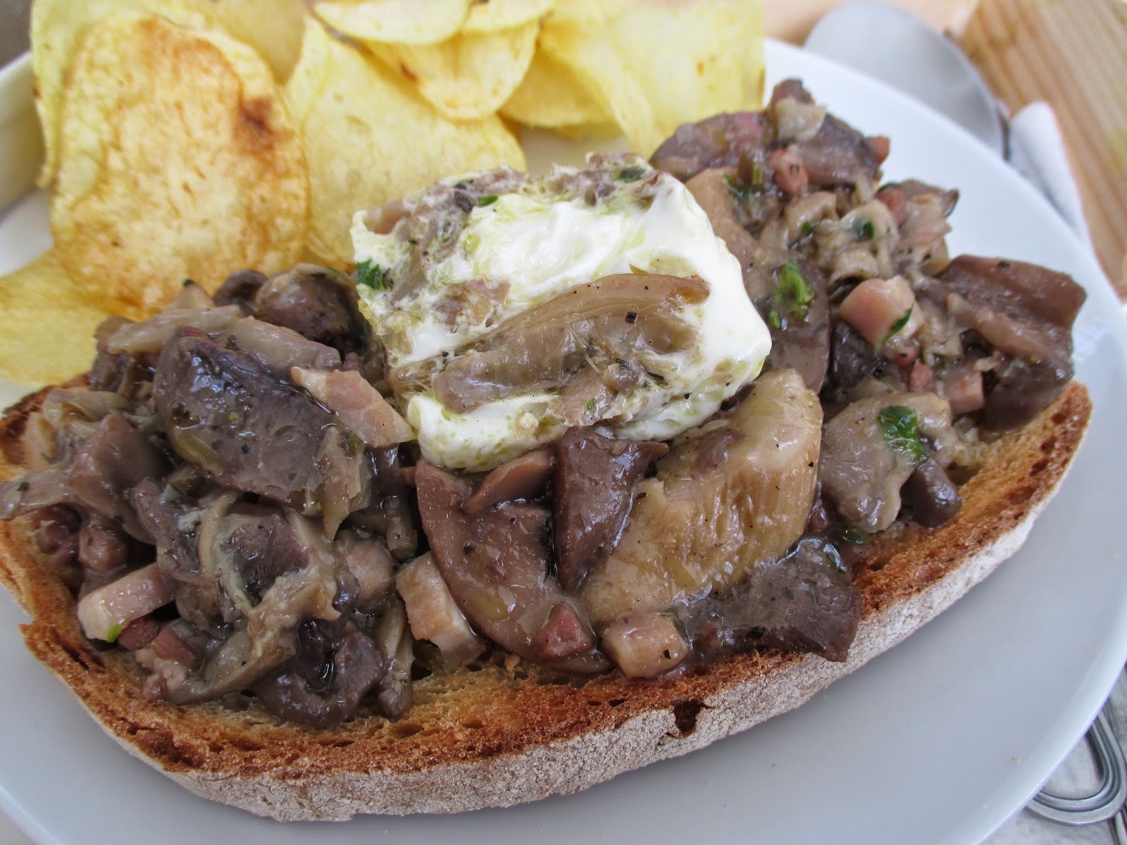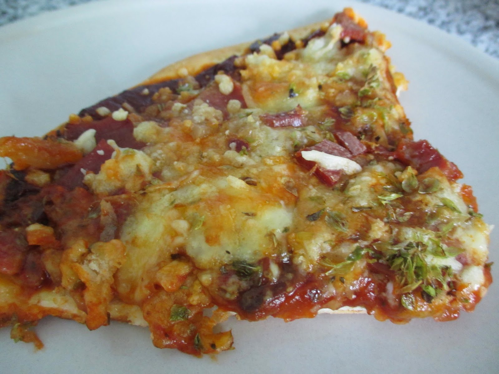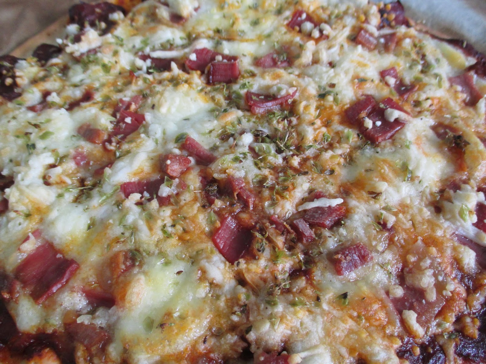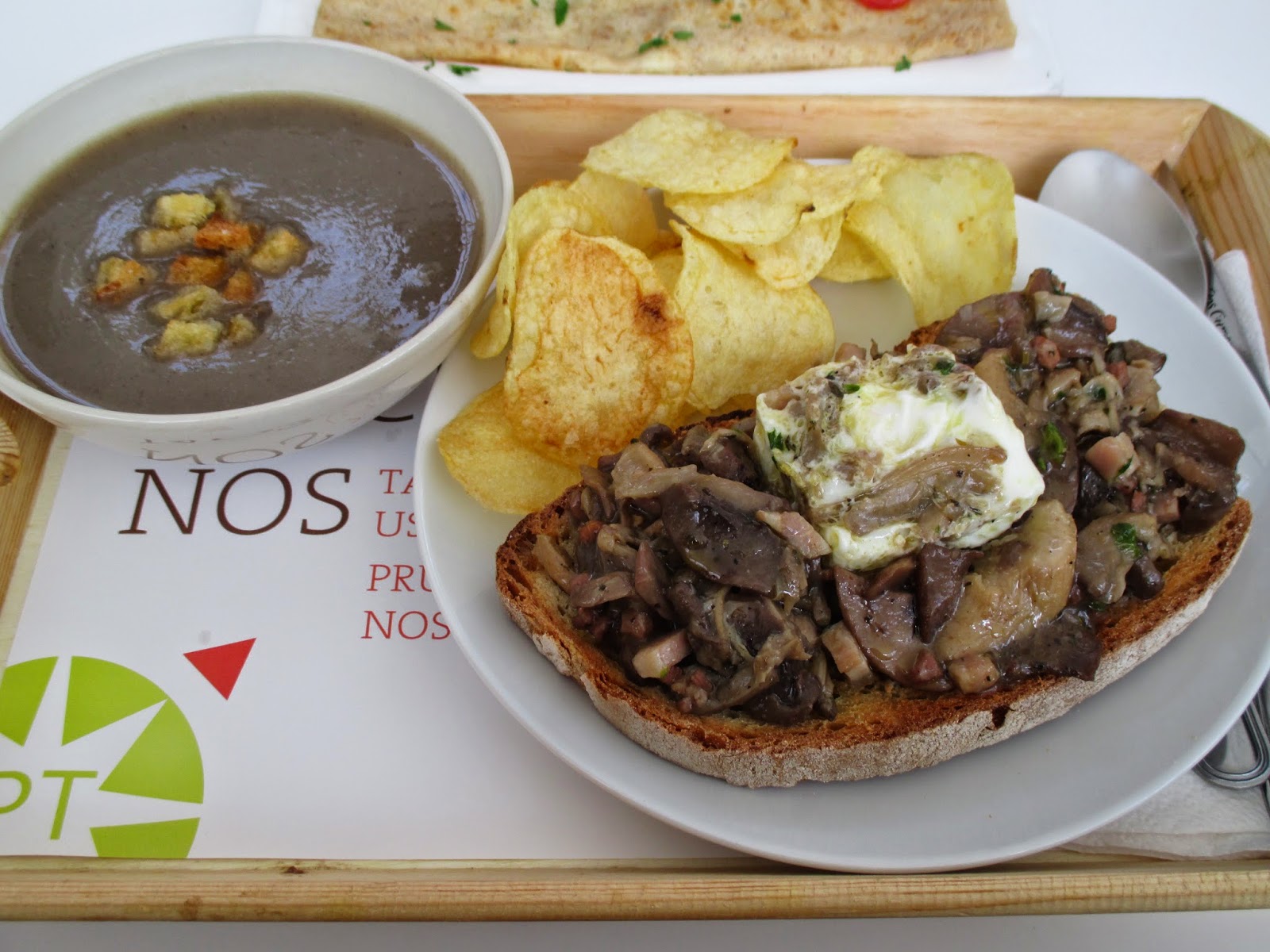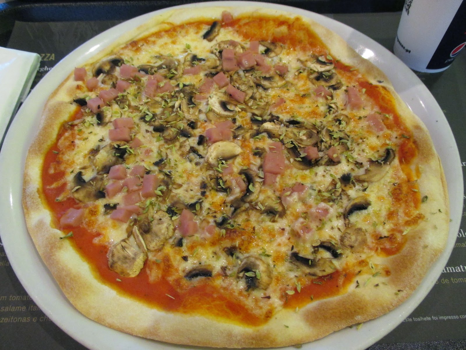 Depois coloquei uma lata de cogumelos, uma embalagem de fiambre cortado em cubos (100 g) e cortei em rodelas algumas azeitonas pretas (também de lata). Por cima espalhei queijo ralado. Depois foi só misturar 3 ovos e um pacote de natas (usei de soja) e espalhei por cima dos outros ingredientes. Depois foi só levar ao forno até dourar.