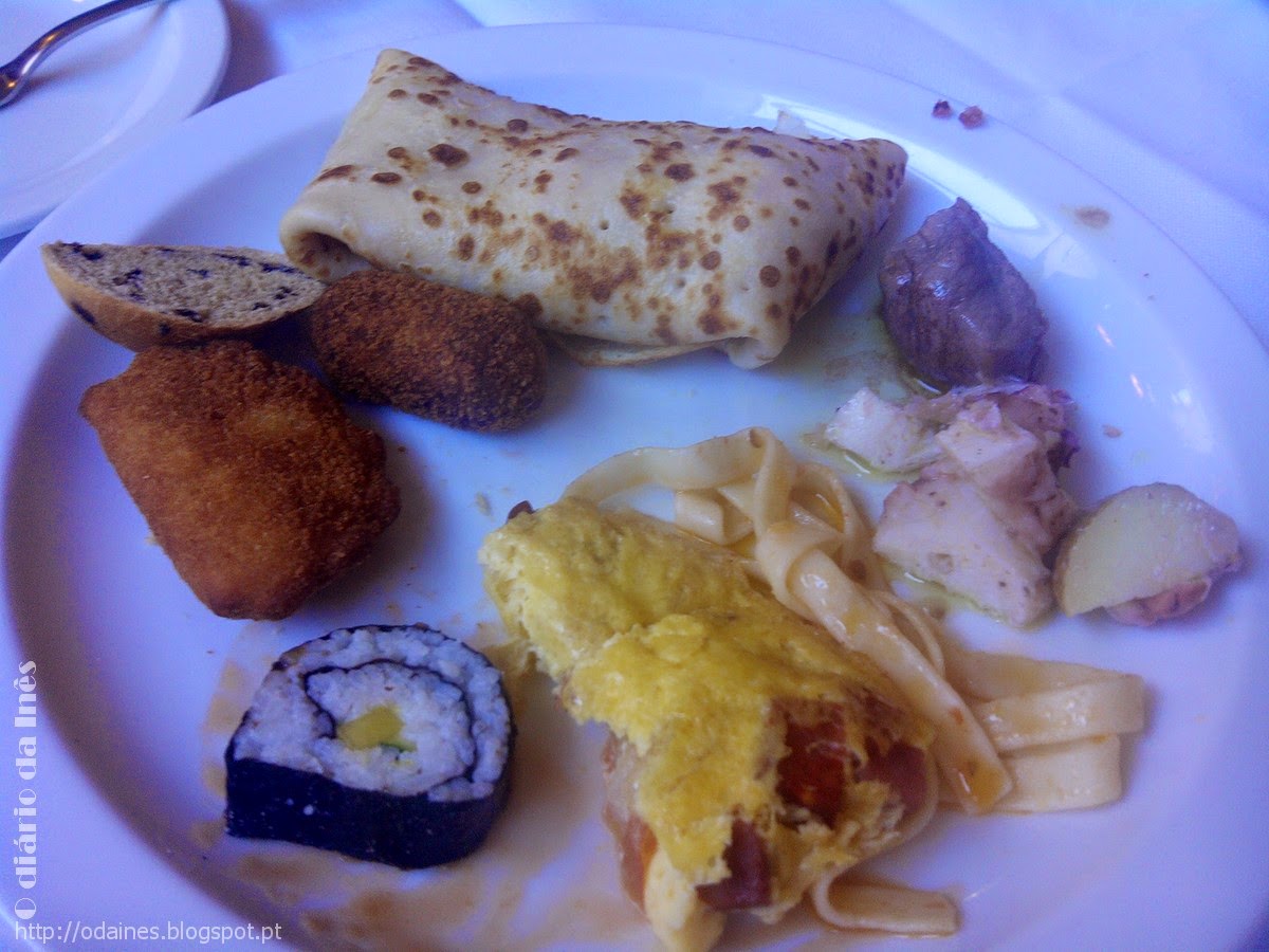Nas bebidas temos café, chá, leite, sumos. Depois temos também iogurtes, cereais, vários tipos de pães, compotas, vários tipos de queijo, fiambre, charcutaria diversa, panquecas com maple syrup, ovos mexidos, bacon, feijão com tomate, tortilha, cogumelos salteados, salgadinhos variados, salmão marinado, sushi, saladas simples e compostas.