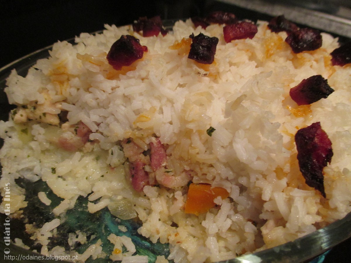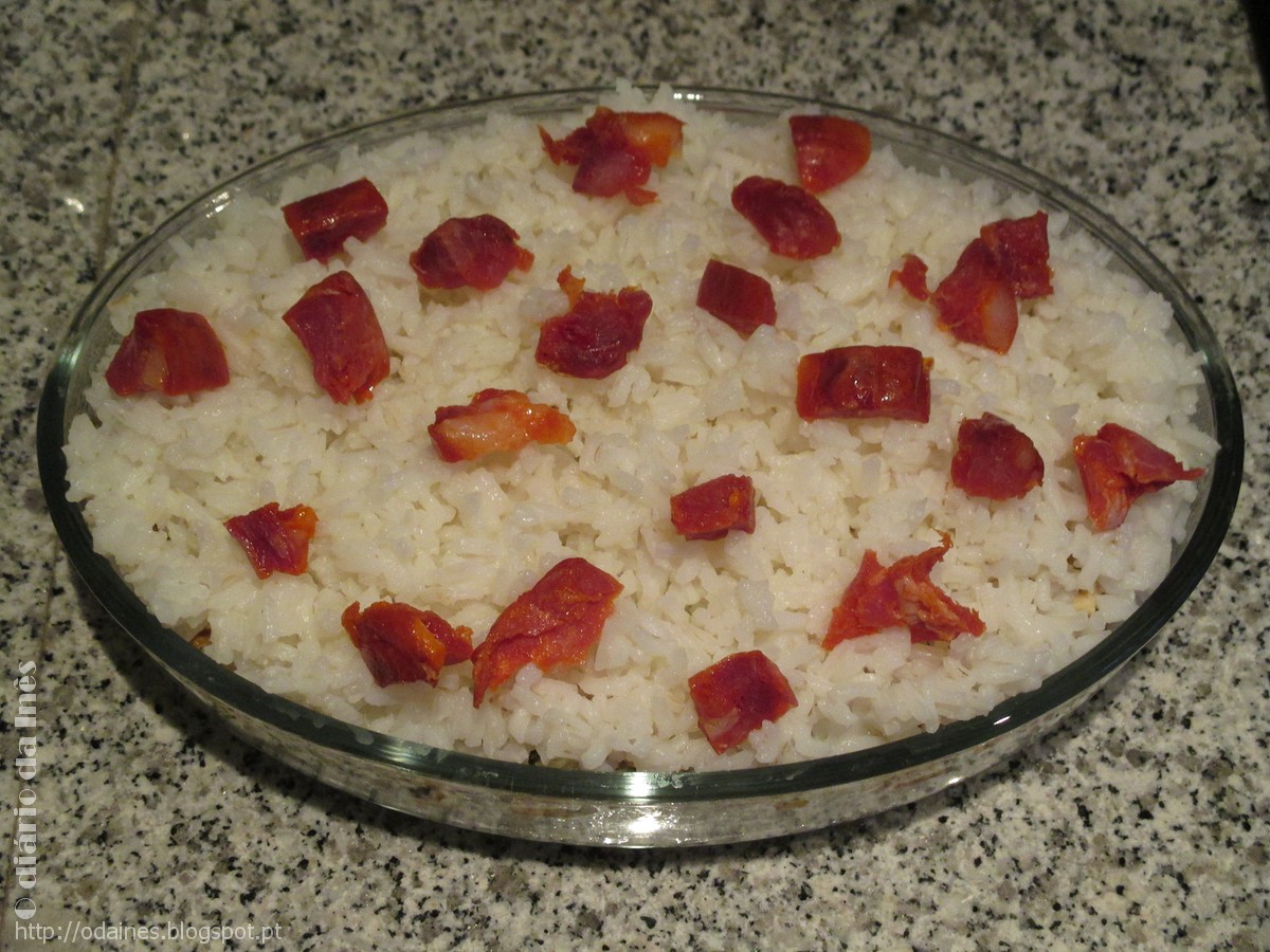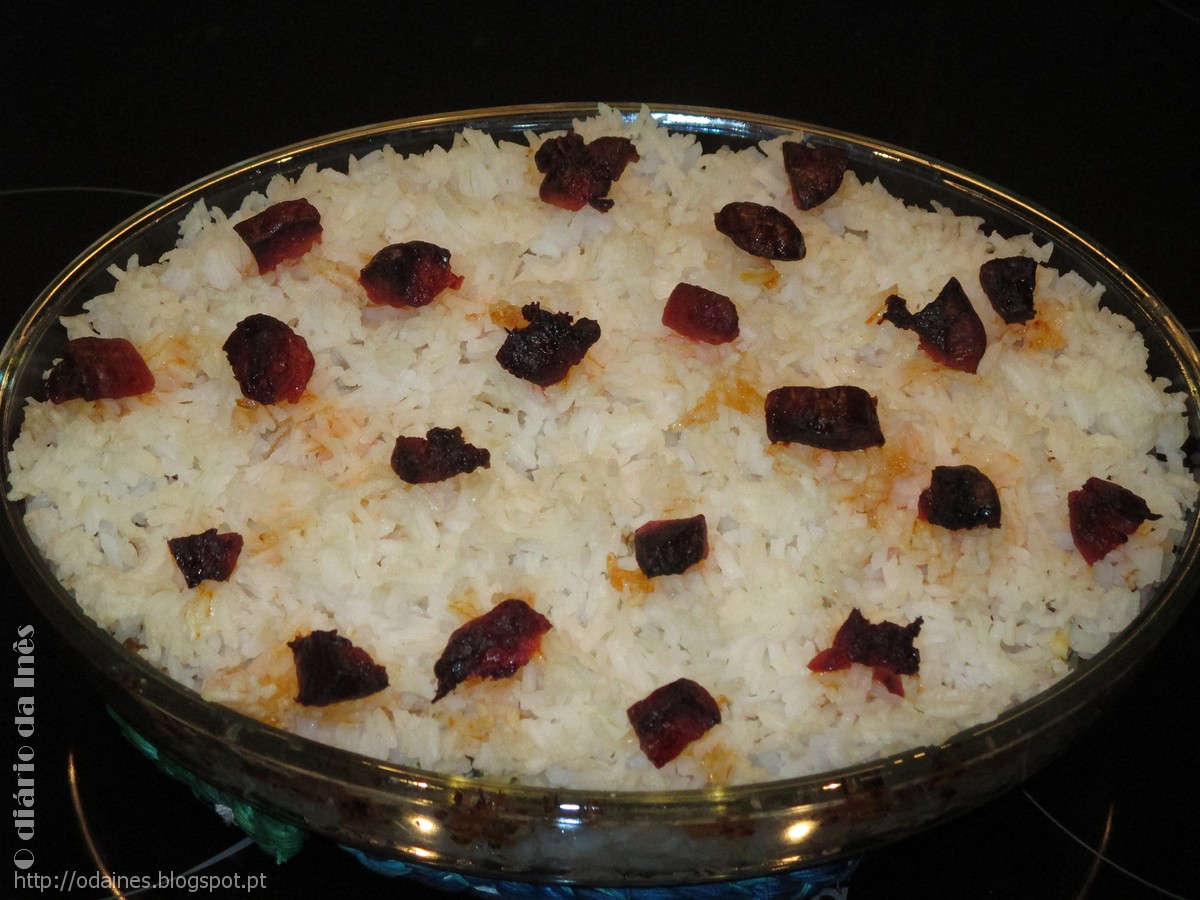 Numa travessa de ir ao forno dispor metade do arroz no fundo, cobrir com a carne e por fim colocar o resto do arroz. Por cima do arroz dispor a linguiça cortada em pedaços. Levar ao forno a alourar.