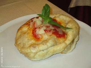 Vamos então à comida que é o que mais interessa. Começamos por uma entrada que eu nunca tinha comido, o calzone frito que é maravilhoso, a combinação da massa exterior frita com o interior cremoso e de sabor intenso é uma explosão de sabores na nossa boca. Peço desculpa por não ter fotografado o interior porque era merecedor de ser visto.