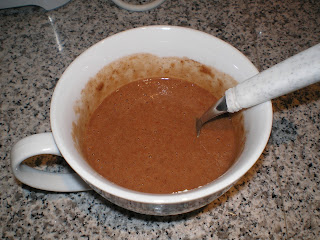 Misturar tudo dentro da caneca e bater muito bem. Levar ao microondas mais ou menos 2 minutos. E está pronto a comer.