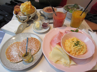 Este brunch é uma coisa do outro mundo, custa cerca de 15€ e é uma brutalidade de comida, dá para duas pessoas na boa! É composto por uma cesta de pão e um croissant ou um scone, mais um sumo de laranja, um cappuccino, salada de alface, ovos mexidos, queijo, manteiga, doce, mel, 2 panquecas e salmão fumado ou perú fumado. Eu e a pessoa que me acompanhou como somos 2 grandes gulosos e queríamos provar tanto o croissant como o scone acabamos por pedir um scone como extra e pedimos também o sumo multivitaminas do dia. Resultado uma barrigada que saímos de lá praticamente a rebolar! Recomendo, mesmo!